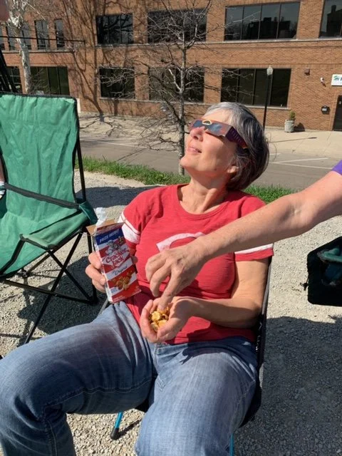 What I am submitting is the gratitude I have for the event having brought so many of us together. Neighbors whom I haven’t seen since winter hibernation began had the opportunity to catch up and share this wonder. I met “eclipse chasers” from SC, MD, and VA. And we discovered that when my wife had her glasses on, we could steal her snacks.